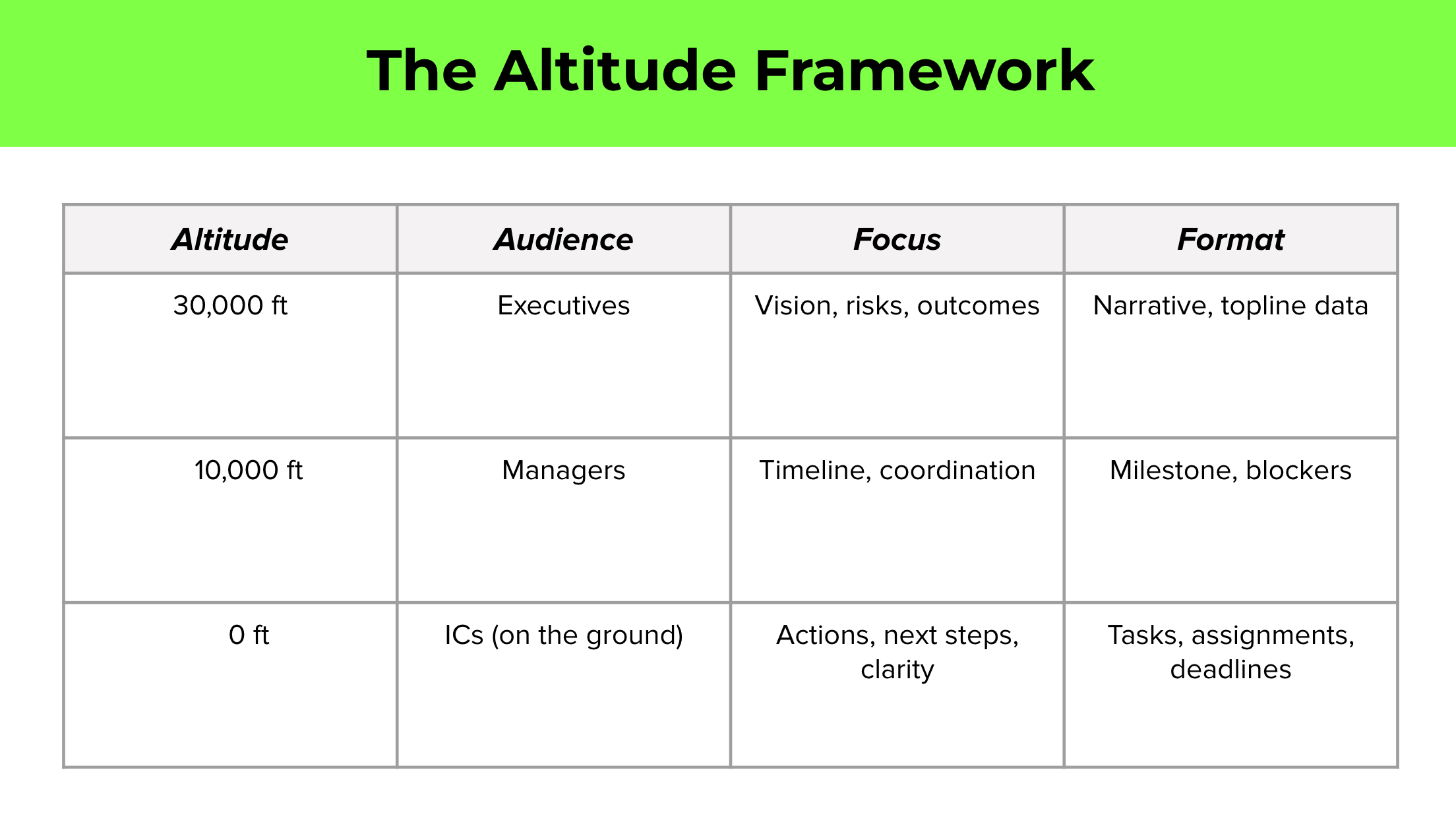 The next time you're about to send an update, a report, or a recommendation — pause. Ask yourself: what's the altitude of the person I'm talking to? And what do they actually need from me right now?