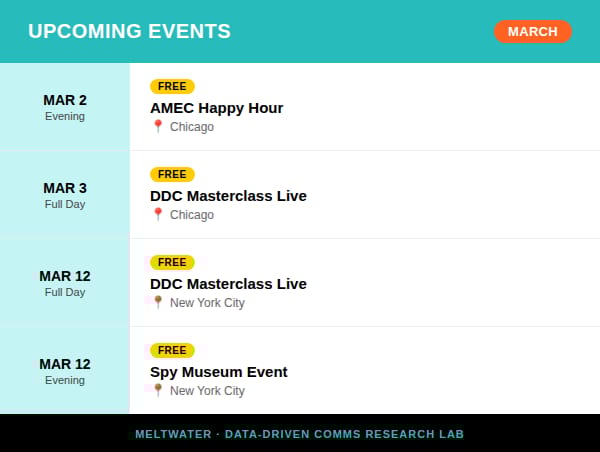 → Amsterdam (March 5) · Washington DC (March 9) · Atlanta / PRSA Higher Ed (March 10) · NYC / AMEC AI Day (March 11) · Customer Advisory Board (March) · Sydney Summit on Tour (May 21)