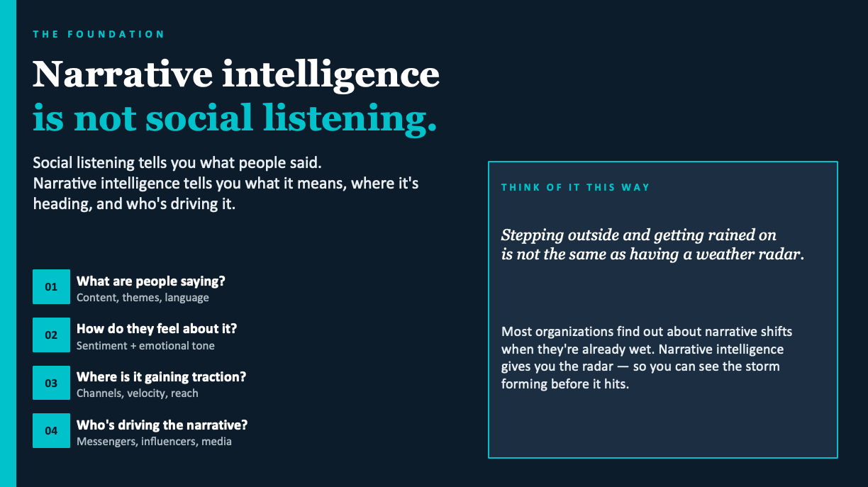 She put it this way: finding out about a narrative shift from a reporter calling you is like stepping outside and getting rained on. Narrative intelligence is the weather radar — you see the storm forming before it hits.